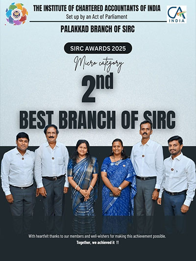 'PALAKKAD BRANCH OF SIRC OF ICAI' , being one of the Decentralized branches under SIRC, is offering a wide range of facilities, prescribed by ICAI, for both members and students. The branch has offered various CPE Programmes, certificate courses, Regional Residential Courses and Library facilities for members. Now during lock down due to Covid 19, Branch is actively conducting Webinars and Virtual CPE Meetings on Various subjects to members.